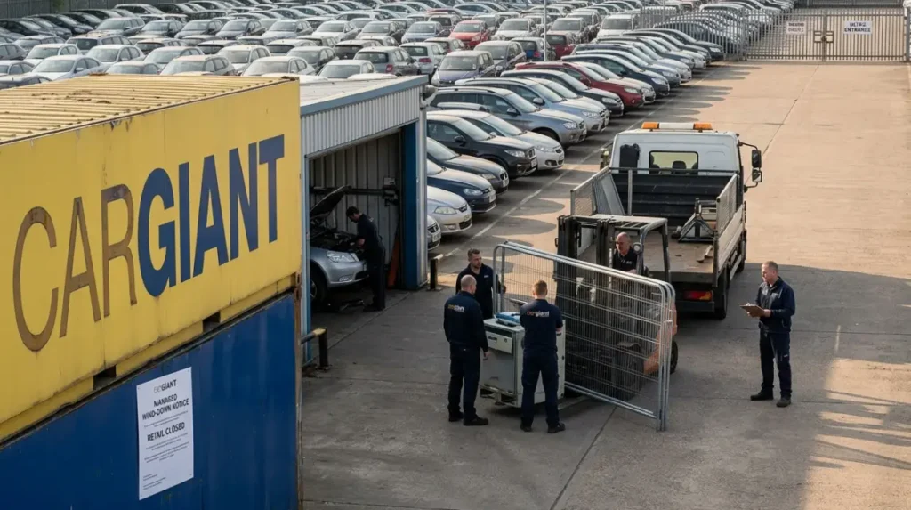 Cargiant began its wind-down on April 24, 2026, ending retail trading at its Park Royal site. The process includes selling remaining vehicles, making around 500 staff redundant, and continuing limited after-sales support during closure.