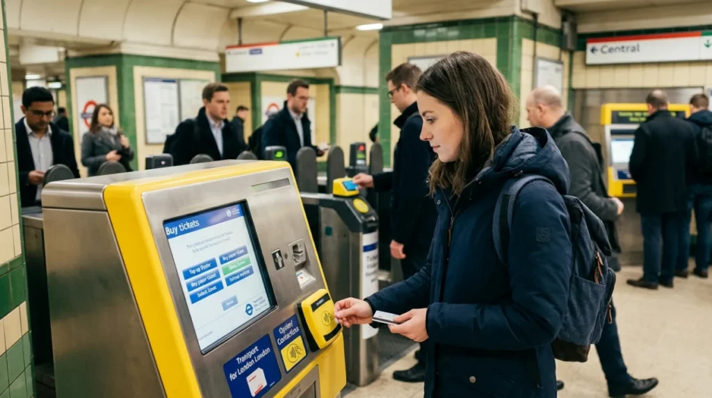 Ticket machines accept cards, coins, notes at all stations. Oyster cards load credit electronically; Visitor Oyster for tourists includes £5-£50 credit. Processes: Insert card at machine, select pay as you go, top up. Examples: Daily cap Zones 1-3 at £8.90 saves 40% over singles.