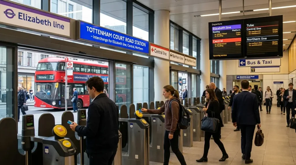 Examples: Tottenham Court Road links Elizabeth Line. Data: 40% multi-modal trips.