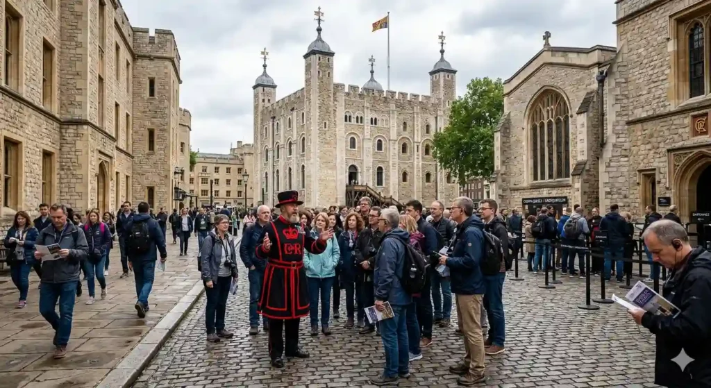 Expect a 1-hour walking Beefeater tour covering Traitors’ Gate, execution sites, and Princes in the Tower story from 1483, with live narration on 12th-century origins and raven lore, no entry to restricted areas; Extra London enhances with photos.