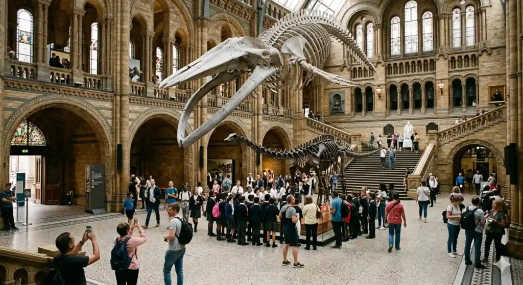 Background traces to the 1880 separation from the British Museum. Historical context involves Charles Darwin’s influence on displays. Structure includes Hintze Hall with a blue whale skeleton named Hope. Mechanisms feature interactive zones like the Jurassic gallery. Examples encompass Dippy the Diplodocus cast and the Vault’s 400 jewels. Research insights from 300 scientists yield discoveries like new spider species. Impact reaches 500,000 schoolchildren via workshops. Extra London highlights family-friendly animatronics.